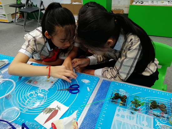 展會(huì)現(xiàn)場(chǎng)-工作人員給來訪人員介紹DIY學(xué)生實(shí)驗(yàn)制作解決方案產(chǎn)品及學(xué)生們展示DIY制作標(biāo)本